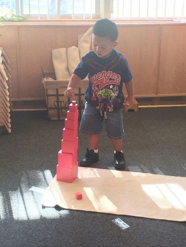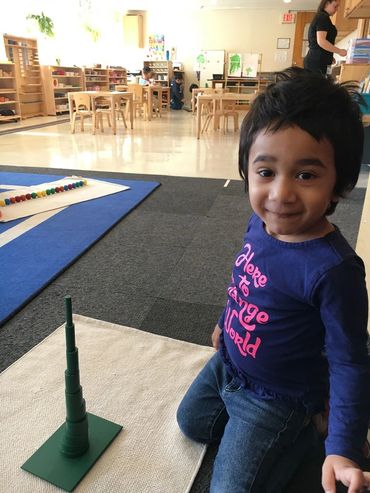 The math materials progress from concrete to abstract. Unlike the traditional way of teaching math in which memorization was the key to doing math correctly, here math is first learned via the senses. This makes math so much more interesting and far easier to comprehend. They first learn and practice counting up to 10 and recognizing the numbers and quantities. They use number rods, sandpaper numbers, number cards, spindle box, cards and counters and more. Once they have become proficient, they are introduced to the decimal system and they end up learning to count eventually to 9,000. Using concrete materials like the golden beads, short bead stair, operation boards and more, the children learn addition, subtraction, multiplication and division. Since they understand it and math is entertaining to work with, they will be confident with their math skills in the future.